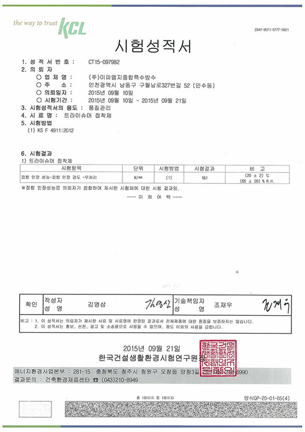 트라이슈머 접착제 시험성적서 최고관리자 접착제 시험성적서 0 7810 2019.02.10 18:06 *시험결과: 트라이슈머 접착제로 접합한 부분은 트라이슈머복합시트의 인장성능(192N/mm)와 근접한 인장성능(161N/mm)을 보여줍니다.