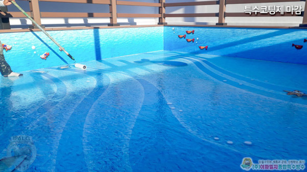 아트패션시트로 풀장 전체를 감싸 마무리 한 뒤 마지막 공정으로 인체에 무해한 환경 친화적인 이파엘지의 특수코팅제를 도포하여 줍니다. 이렇게 자외선과 물에 강하고, 내구성이 강해 오래가는 수영장방수공사를 마무리 하였습니다.