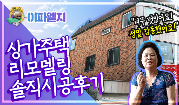 "이파엘지 직원들 너무 너무 감사드리고요, 저는 정말 감동을 받았어요!" 대전에 사시는 한 상가주택 건물주 고객님께서는, 비만 내리면 노후 된 건물의 갯물처럼 쏟아지는 누수 문제로 저희 이파엘지를 찾아주셨습니다. 이파엘지의 광고를 보시고 견적을 의뢰하실 때 까지만 해도, '방수'만이 목적이었지만 디자인까지 더해 오래 되고 노후 된 건물을 새 건물처럼 탈바꿈 시켜주는 '아트패션시트 외벽 리모델링 시스템'을 알게 되신 후 바로 본 공법을 선택! 그렇게 공사가 진행되었습니다. 한 여름 땡볕에도 고객님과의 약속을 위해 부지런히 시공에 임한 모습을 보시고 정말 감동이셨다는 고객님.. 대신 어머니 손맛 같은 맛있는 집밥으로 끼니도 대접해 주셔서 정말 저희도 감동스러웠답니다. :-) 시공 후, 동네 분들께서 '언제 빨간 벽돌을 쌓았냐' 라고 하실 정도로 예쁜 붉은색의 벽돌집이 완성되었는데요, 시공 전 '무료 시뮬레이션 서비스'를 통해 직접 선택하신 디자인인 만큼 고객님께서는 더 더욱 만족스러워 하셨습니다. 확실한 방수성으로 누수 문제의 해결은 물론, '아트패션시트'는 비용이 부담 될 경우 고객님 건물과 같이 부분적으로 시공이 용이하기 때문에 비용 부담을 줄일 수 있다는 장점도 있습니다. 또한 뛰어난 단열 보온 성능과 난연형 자재로 화재에 대한 안전성까지 보장되는, 소비자를 위한 착한 외벽 리모델링 방수 시스템 입니다. :-D 고객님의 솔직함이 담긴 시공후 인터뷰와 시공 과정을 영상을 통해 확인해 보세요! ----------------------------------------------------------------------------- ▶블로그에서 더 자세한 시공사례를 확인해 보세요! http://waterproof01.blog.me/221090210653 ▶전문가에게 "무료 방문견적"을 신청해 보세요! https://ipalg.co.kr/bbs/write.php?bo_...